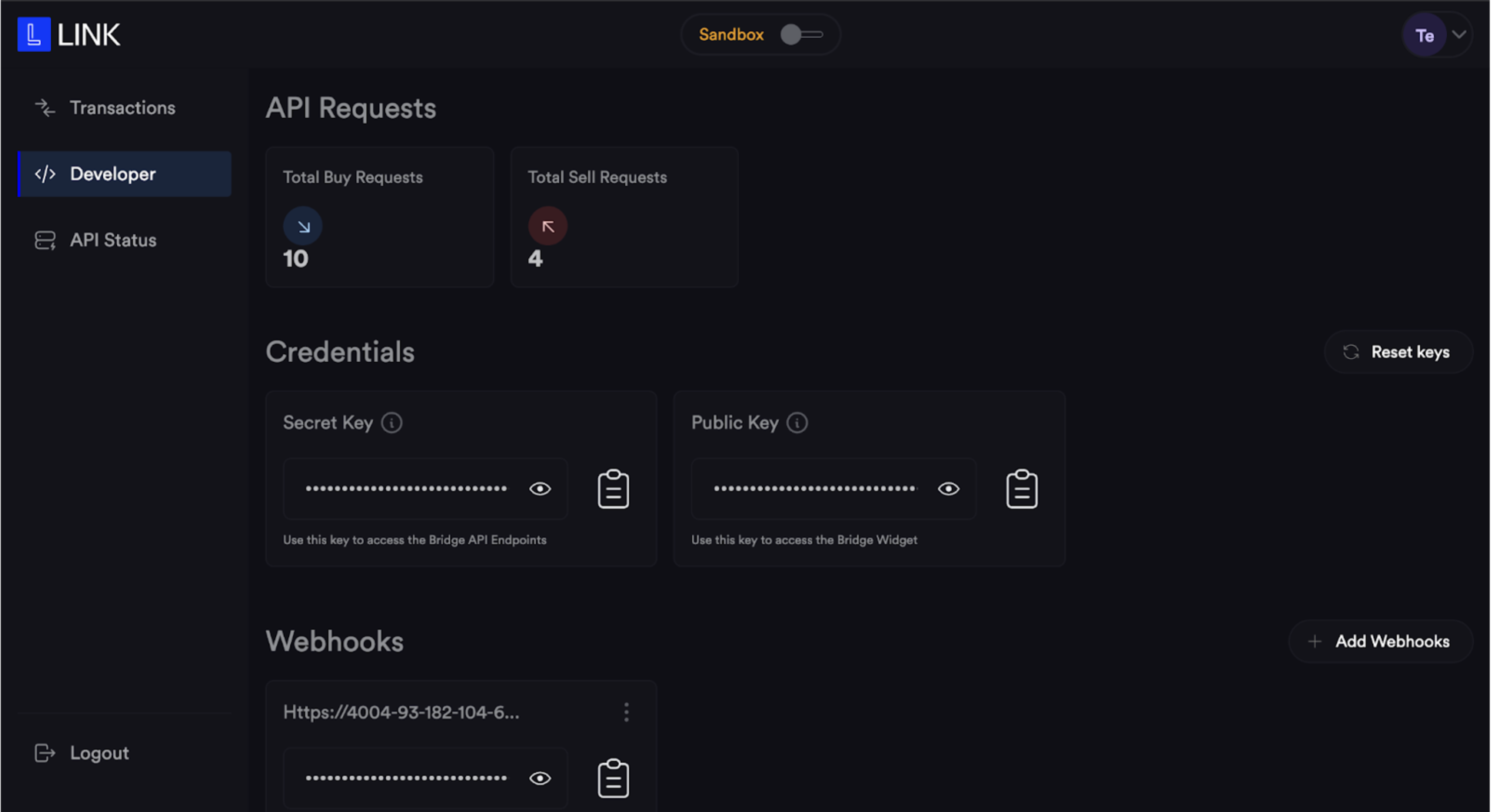 Your Secret Key is used to authenticate all API requests. It can be found in your LINK Bridge Dashboard under the Developers section.
