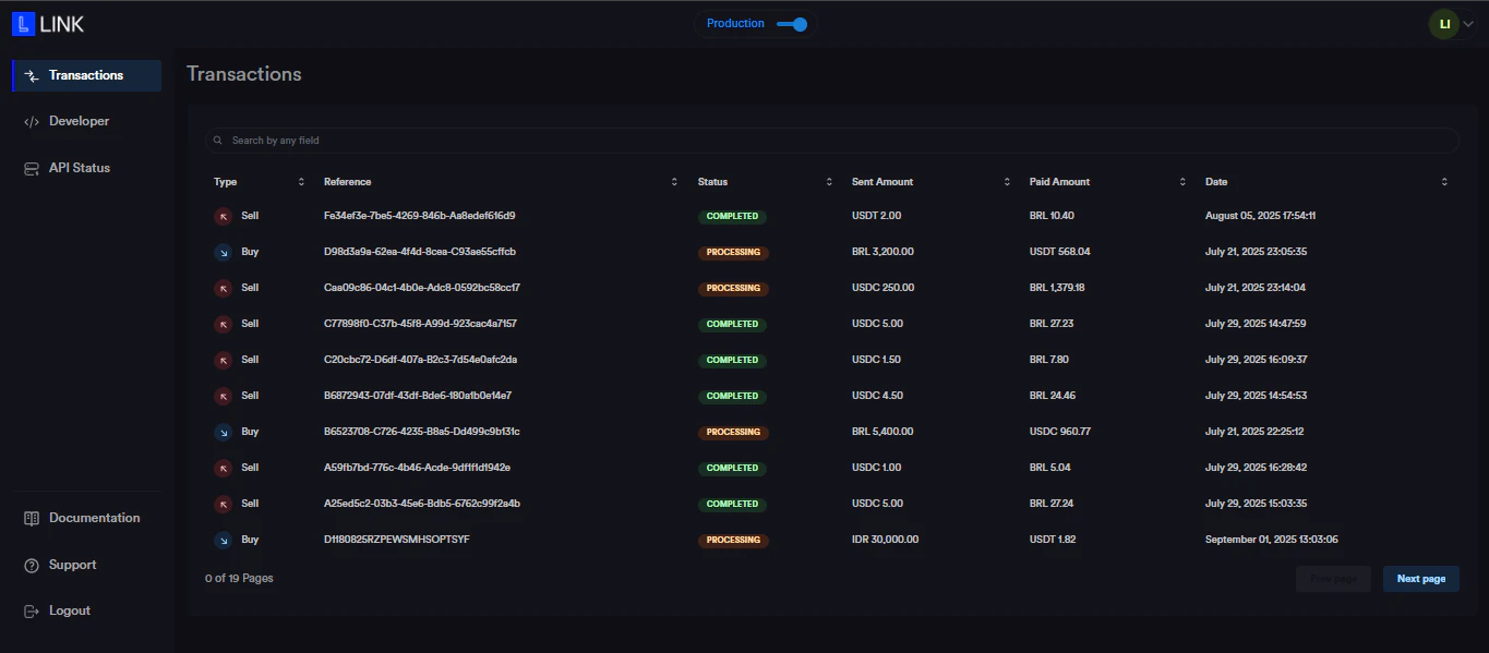 The LINK Bridge API Dashboard is designed for developers who need full visibility into integration activity.Transactions