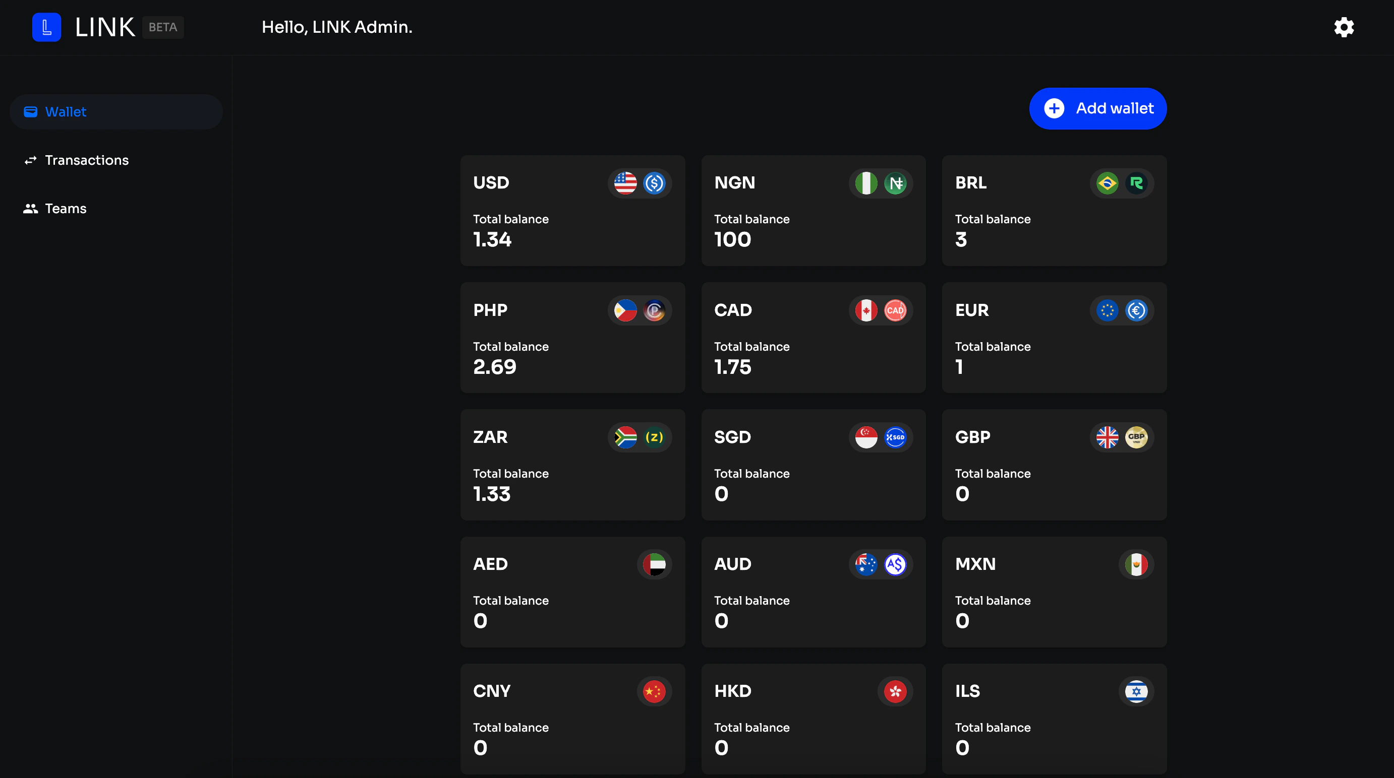 - Add Wallet – create new fiat or stablecoin wallets in supported currencies. Each wallet has a unique balance view, deposit instructions, and withdrawal options.