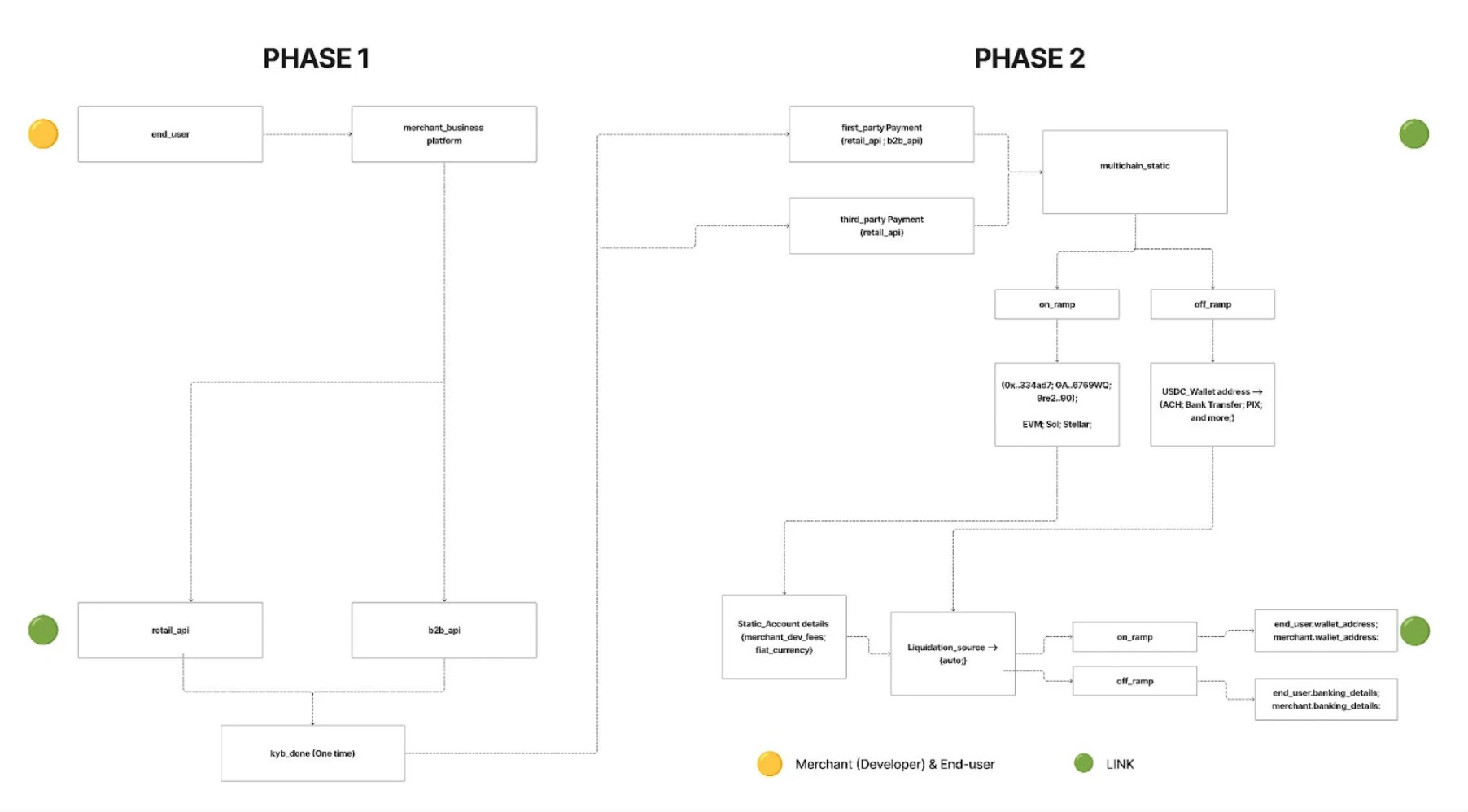 LINK Multichain Static accounts are on-request, permanent, reusable fiat deposit addresses with a randomly generated reference. These accounts automatically convert incoming fiat into USDC or USDT and deliver it to your specified destination (e.g a wallet address) on the supported blockchains. See supported blockchains They support multiple currencies and provide customers with local deposit details, such as account numbers and routing codes. See supported Payment Rails For example, a USD virtual account provides your customer a U.S. account and routing number for ACH or wire transfers.Multichain Static accounts are available via the Retail and B2B APIs and can also be managed through the LINK Business Dashboard (GUI).