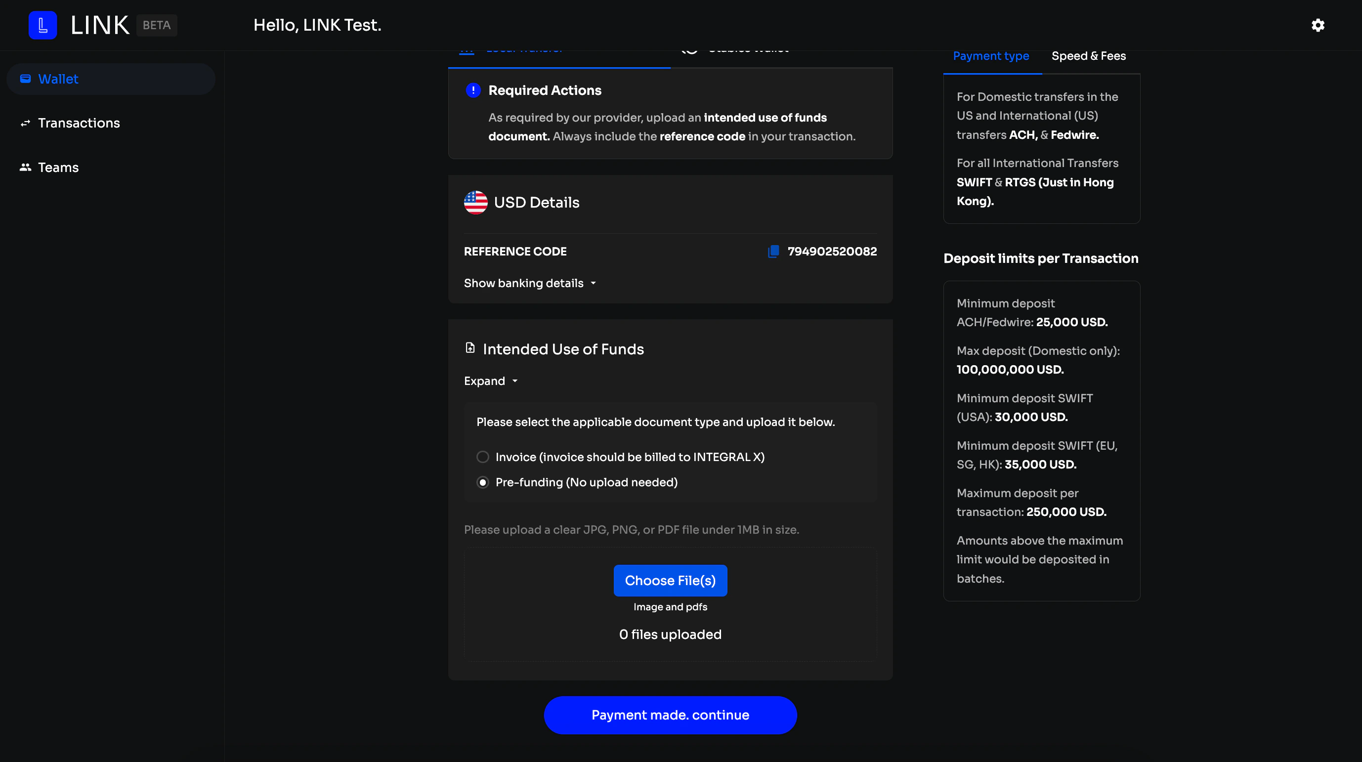 You can fund a Prefunded Account via the LINK Business Dashboard using your USD Wallet. You can also choose to fund in other currencies using various methods — all of which auto-convert to USD and credit your prefunding balance. See supported currencies For example, to prefund $100,000 for customer on-ramps, you could:- Load USDC via any supported blockchain network directly from the dashboard.