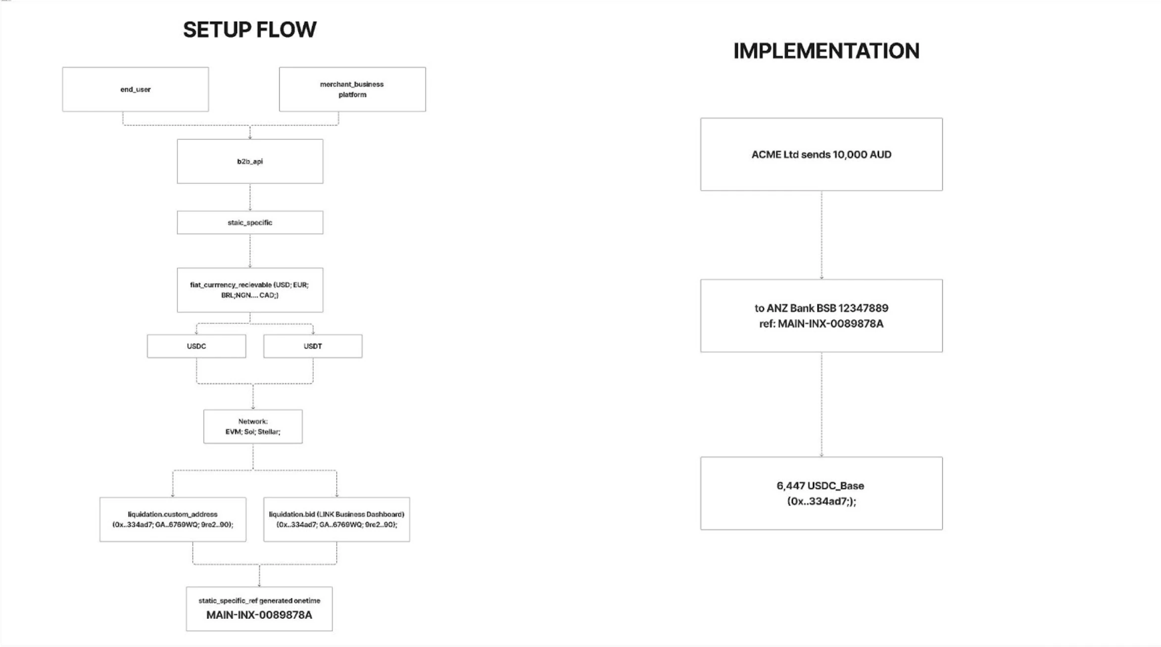 LINK Static Specific accounts are on-request, permanent, reusable fiat deposit addresses with randomly generated compulsory references. These accounts automatically convert incoming fiat into USDC or USDT and deliver it to your specified destination (e.g., a wallet address) on only one of the supported blockchains. See supported blockchains Effectively, they serve as an on-ramp to liquidation addresses, with your reference code acting as the primary identifier. They support multiple currencies and provide customers with local deposit details, such as account numbers and routing codes. For example, a USD virtual account gives your customer a U.S. account and routing number for ACH or wire transfers.NOTE: This is supported only by our B2B APIs.